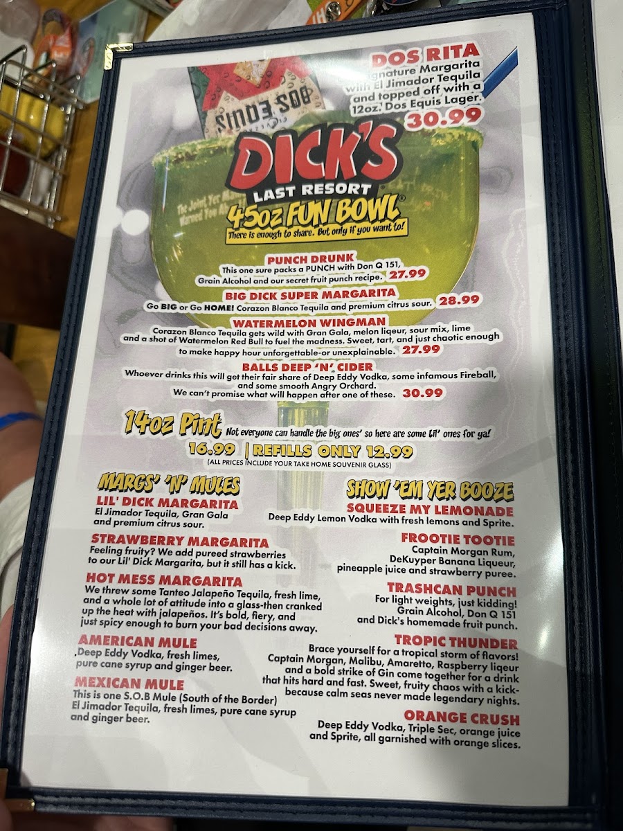 “ Right off the bat our server (Jackson) gave us the rundown about how the service works, and the menu. My group had a blast being here. The atmosphere was fun, the servers were funny and let you jab at them too. Jackson was very funny and had my entire group laughing to tears, he helped me pick out the best shirt to go with the shorts I bought. The food was fantastic, I got the 12” wiener with chili and took it down like a champ and washed it all down with a delicious 45oz marg. Next time I’m in town I definitely will be coming back! Thank you for the excellent and fun service Jackson! ”