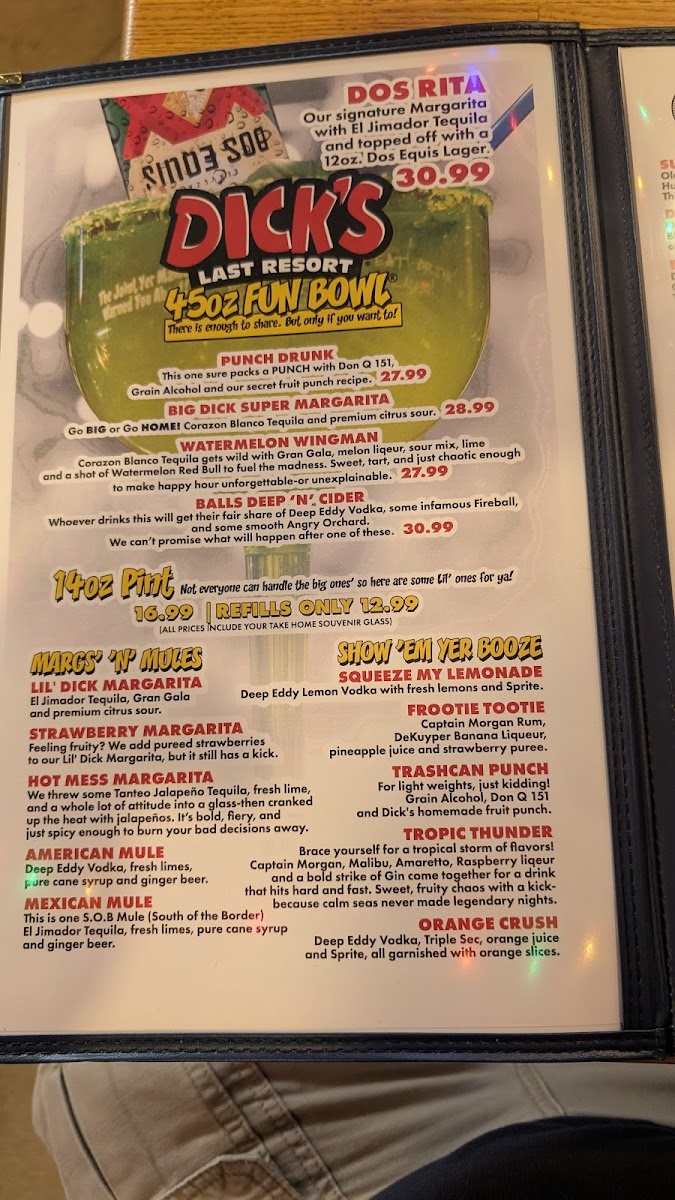 “ The wife and I love to go to Dick's Last Resort and have visited 4 of them so far. This new one in Orlando opened so we had to try it out while we were in town. It is located in the large open outdoor mall area and although there is a huge parking garage next to it parking was tight and you had to walk a little to get there. The atmosphere was fun and the staff were very involved in helping you have fun. There were kids having horse races around having fun and adults laughing and enjoying themselves. The food was reasonably prices for a tourist spot. There was a 79 Dick's Meat challenge I would like to try! The room was loud and the music was pumping so the smart ass comments the waitress and I were exchanging were sometimes lost but it was fun. An experience every one should try, take the Mother-in-law here but don't tell here she will be the entertainment. FUN. ”